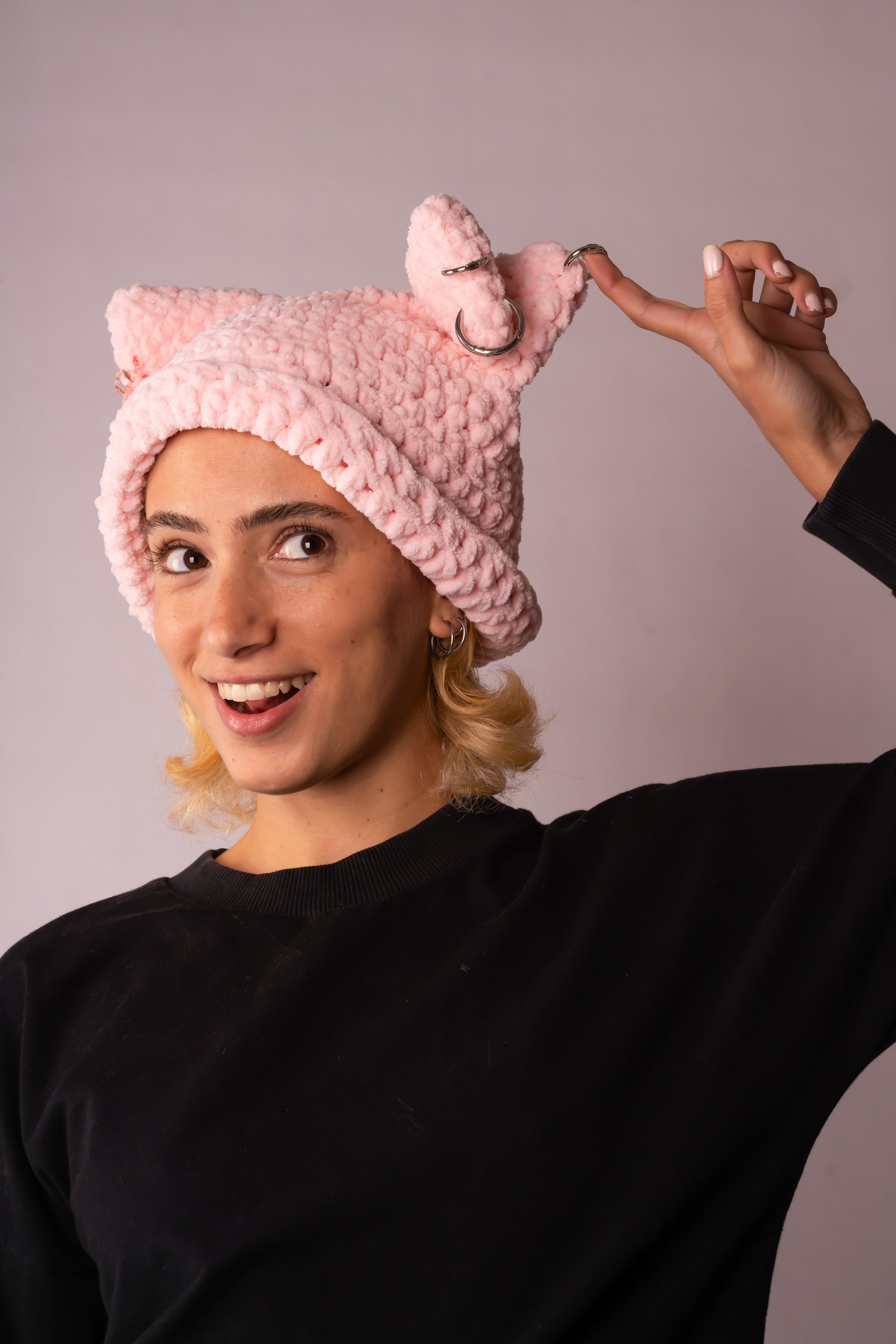 Handmade crochet beanie in soft, velvety baby pink yarn. Four playful ears, each adorned with silver earrings, add a whimsical touch. One-size fits most. Can be customized to any color🐾